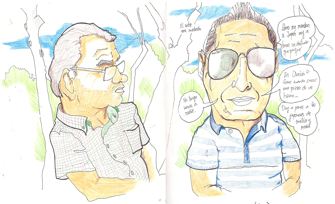 Sin levantarme de la silla me abstraigo y comienzo a observar. A uno lo tengo frente a mí y el otro a mi izquierda. Comienzo el dibujo: perfilo las gafas, la cara y enseguida empiezo a oír frases y sentencias que hacen que deje el trazo y escriba. Acabo el dibujo del primero y comienzo con el segundo. Lo tengo de perfil, así que será rápido. Mi segundo modelo no dice nada, sólo escucha al primero. Este continúa y continúa llevando la voz cantante de la conversación.